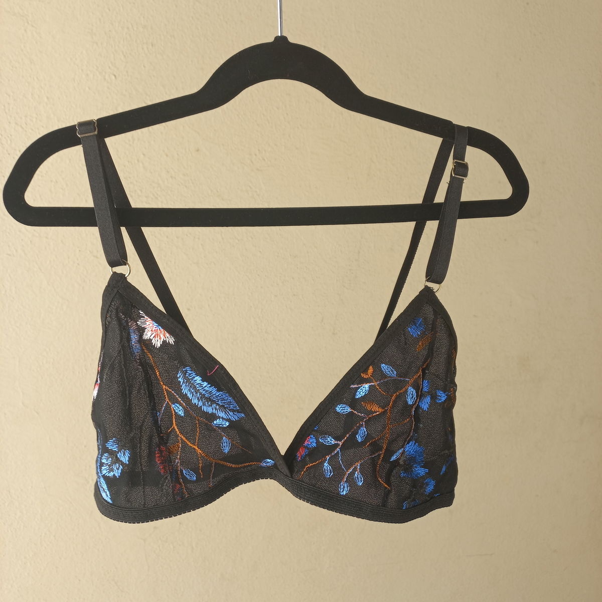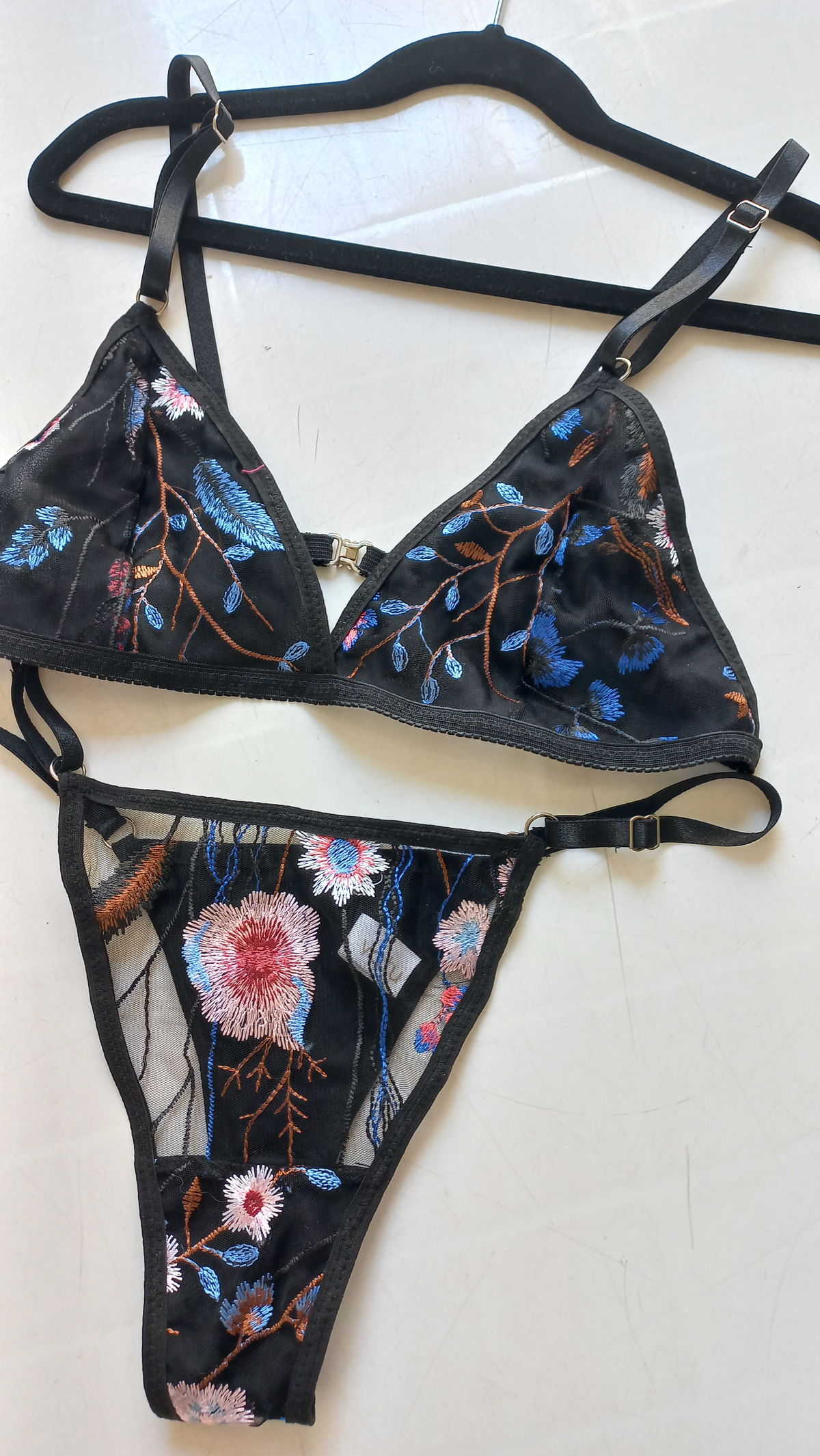 Corpiño triangulito en conjunto con less regulable confeccionados en microtul bordado