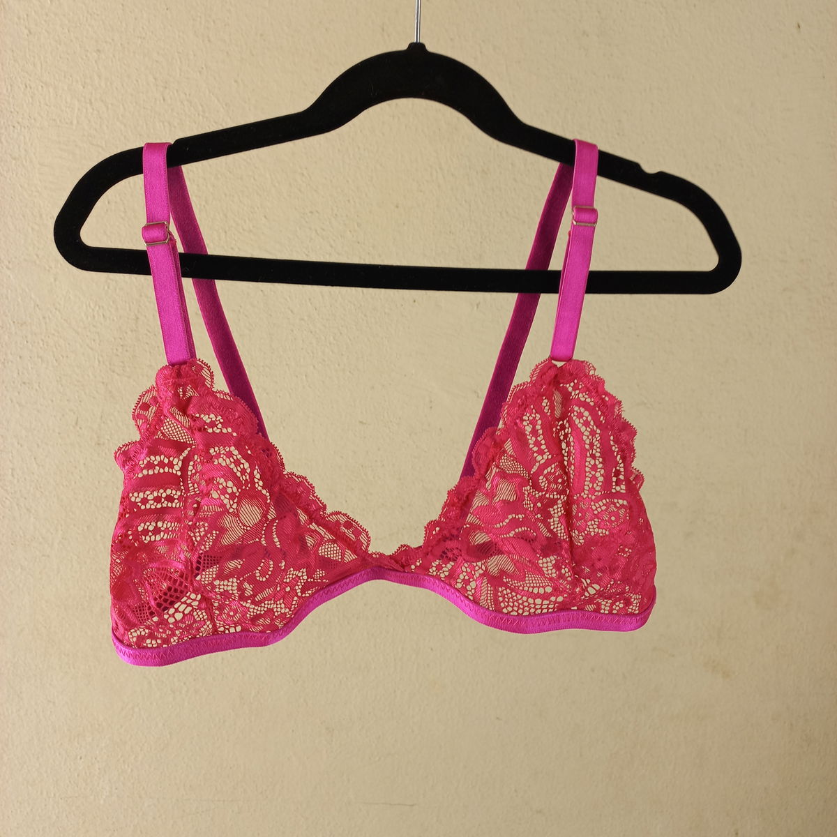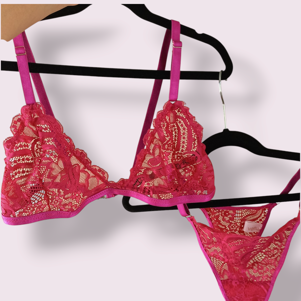 Corpiño triangulito en conjunto con less regulable . Confeccionados en puntilla de encaje fucsia